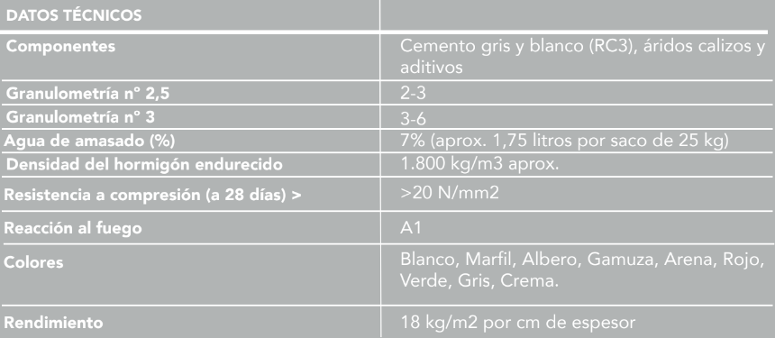 Producto a base de cemento, áridos calizos de granulometría controlada y aditivos que mejoran sus propiedades de plasticidad y trabajabilidad.